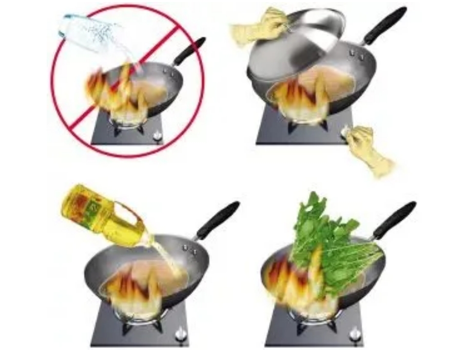 (四)油锅起火不能用水扑救,关闭阀门,盖上锅盖或用湿布覆盖,还可以放入切好的蔬菜。